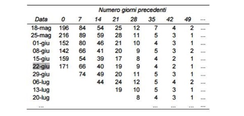 Iniziamo con il 22 giugno. Prendiamo il valore del giorno zero della tabella precedente e lo sottraiamo ad ogni settimana precedente. Quindi la riga del 22 giugno è composta così: (171 – 171) = 0, (171 – 66) = 105, (171 – 40) = 131, (171 – 19) = 152 ecc.. ed analogamente per i giorni precedenti al 22 giugno così da poter ricavare questa tabella.